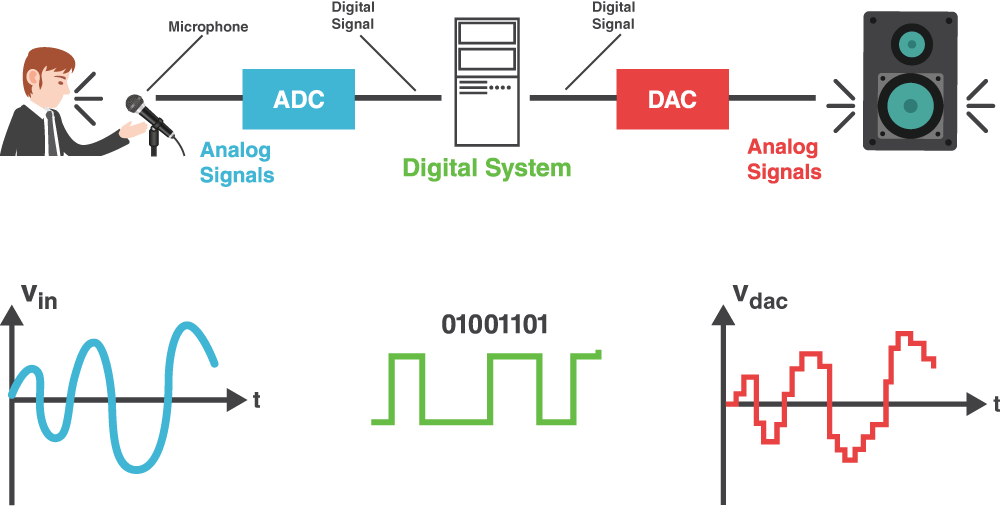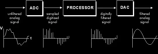 As the name suggests, digital signal processing is the processing of signals in a digital form. DSP is based upon the fact that it is possible to build up a representation of the signal in a digital form. This is done by sampling the voltage level at regular time intervals and converting the voltage level at that instant into a digital number proportional to the voltage. This process is performed by a circuit called an analogue to digital converter, A to D converter or ADC. In order that the ADC is presented with a steady voltage whilst it is taking its sample, a sample and hold circuit is used to sample the voltage just prior to the conversion. Once complete the sample and hold circuit is ready to update the voltage again ready for the next conversion. In this way a succession of samples is made.